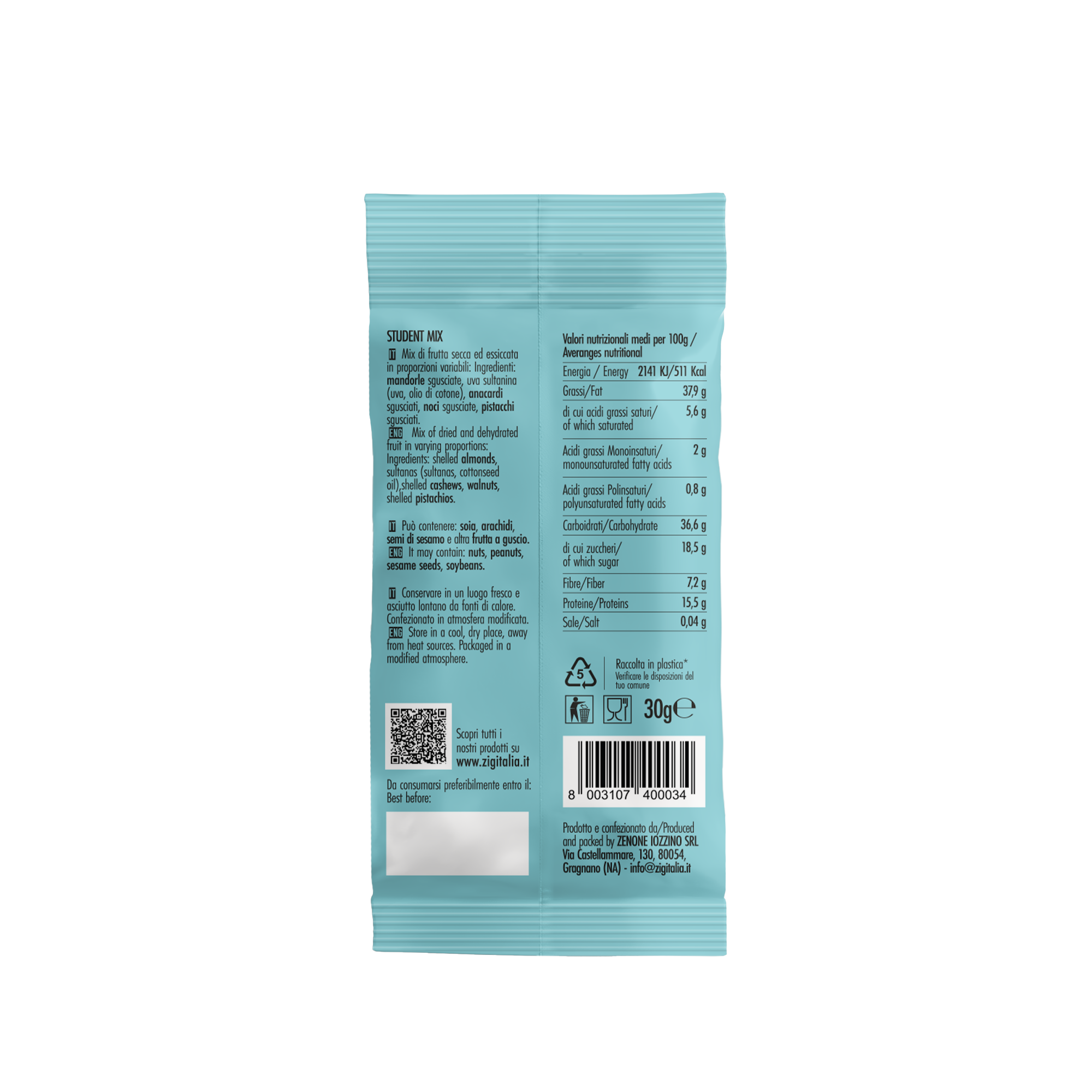 Pack monoporzione, in colori diversi per appagare tutti i gusti: lo snack degli studenti, degli sportivi, dei salutisti, dei golosi. Uno snack di Frutta Secca ed Essiccata per consumatori consapevoli.